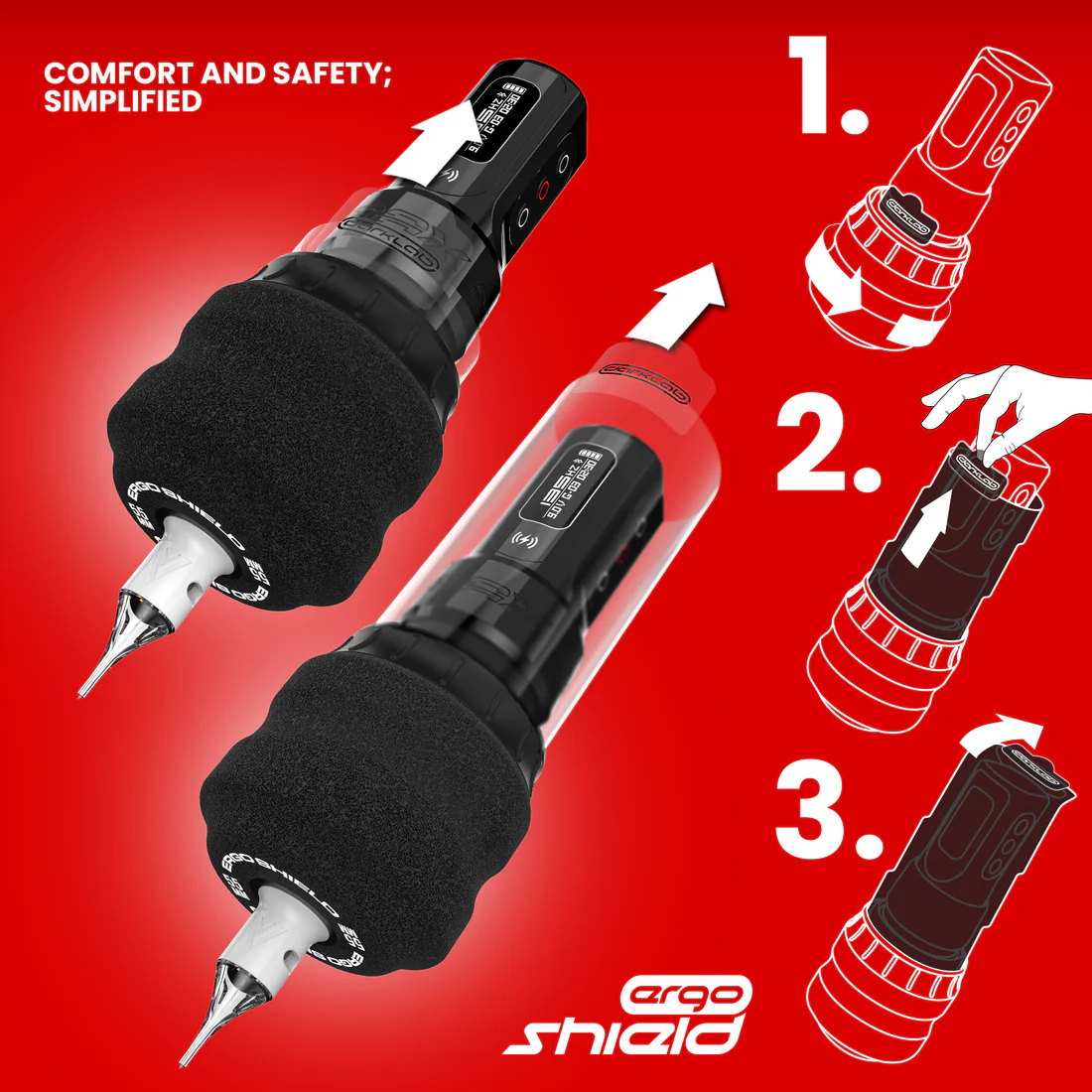 I grip per tatuaggi in schiuma usa e getta FK IRONS Ergo Shield sono una rivoluzione nella sanificazione delle macchine e consentono di collegare una comoda impugnatura monouso e di proteggere le macchinette FK IRONS wireless in soli 10 secondi!