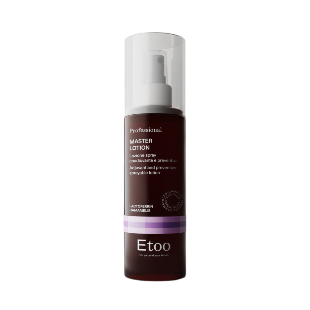 ETOO MASTER LOTION è una lozione spray con una formula esclusiva, basata sull’associazione sinergica tra la Lactoferrina, un antibatterico naturale endo-organico, e un distillato di Hamamelis Virginiana ad azione astringente, lenitiva e delicatamente emostatica. Grazie all’azione combinata dei suoi componenti facilita e rende più sicura l’esecuzione del tatuaggio.