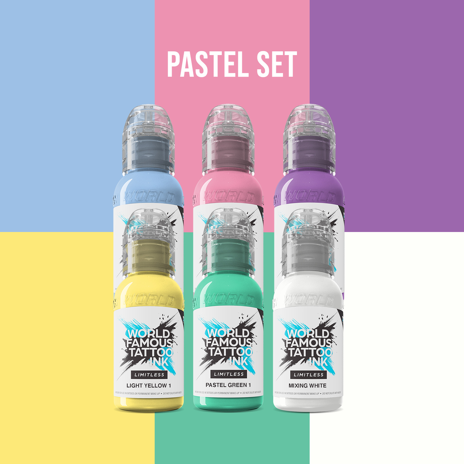 World Famous Limitless Pastel Collection è un set con una gamma di 6 inchiostri dalle tonalità pastello, tutti pienamente conformi alle normative REACH 2023 e contiene i seguenti colori:
