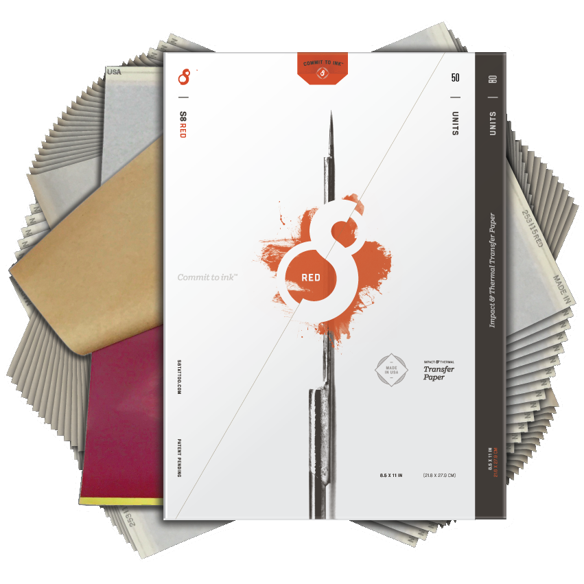 S8 Red è la prima carta copiativa per tattoo di colore rosso al mondo ed è utilizzabile sia con stampante termica che come carta ectografica a mano. La S8 Red è stata creata in rosso in quanto il colore risulta ideale per lo stencil offrendo un contrasto maggiore tra lo stencil e il tatuaggio (specialmente sui lavori di linea e di tracciamento con inchiostri neri). La S8 RED ha una formulazione composta da una miscela brevettata a base di coloranti approvati dalla FD&C e D&C e di cere minerali e vegetali per uno stencil da tatuaggio sicuro, durevole e adatto a qualsiasi tipo di pelle.